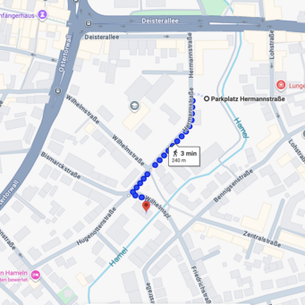 (Hermannstr. 5, 31785 Hameln): unbegrenzte Parkdauer, 240 m zur Praxis.